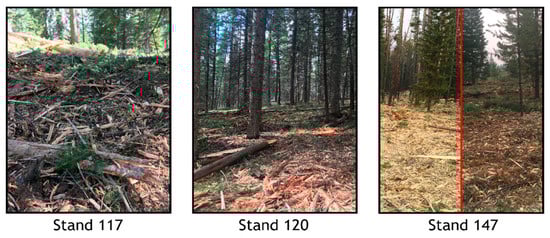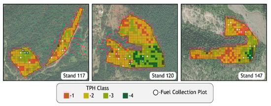 The treatment prescription for the stands included a target range for post-treatment stocking level. For the units in this study, the operator was instructed to leave 40 to 80 trees per hectare after treatment while removing only stems less than 18 cm (7 inches) in diameter. Further, all dead and down material up to 30 cm (12 inches) were masticated []. Post-treatment surface fuel sampling occurred in the masticated portions of three replicate stands: 117 (13 hectares), 120 (15 hectares), and 147 (10 hectares), within the management boundary. Due to many downed trees in stand 147, meeting the prescription specification for dead and downed material was not operationally feasible. Therefore, the mastication intensity for downed trees was reduced after stand 147 was partially treated. This prescription adjustment was used for treating the remainder of stand 147 and for the entirety of stands 117 and 120 [] (Figure 2).