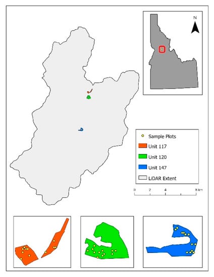 - Fekety, P.A.; Falkowski, M.J.; Hudak, A.T.; Jain, T.B.; Evans, J.S. Transferability of lidar-derived basal area and stem density models within a Northern Idaho ecoregion. Can. J. Remote Sens. 2018, 44, 131–143. [Google Scholar] [CrossRef]