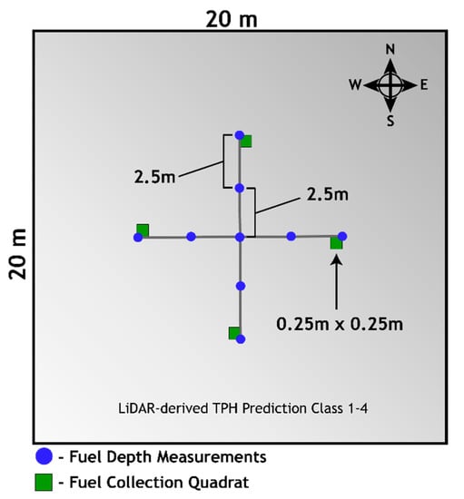 In the fuel collection process, future studies should incorporate a hybrid, plot-based, and planar intersect method, as suggested by Kane et al. []. Doing so may help to ensure a more accurate representation of the fuel classes, as 1-h and 10-h fuels are more accurately represented in plot-based sampling [], while planar intersect methods cover greater proportions of the overall masticated area, properly representing the 100-h and 1000-h fuels that may be missed in plot-based approaches []. Supplemental planar intersect sampling was not performed in this study due to the small 20 m × 20-m pixel size and the concern that sufficiently long intersect paths would extend too far to sample plot edges and be impacted by the distribution of fuels from adjacent pixels. Increasing the pixel size used in predicting the stand characteristics from the LiDAR, as described above, would enable an easier implementation of supplemental planar intersect sampling. Additionally, due to the variability of fuel distribution across the forest floor, plot-based sampling in future studies should use larger sampling quadrats than the 25 × 25-cm ones used in this study. Alternatively, a larger number of 25 × 25-cm sampling quadrats may also provide a greater representation of overall fuel variability within the sampling plot. The goal in using a smaller sampling quadrat in this study than those described in previous studies [,] was to create an efficient and effective sampling procedure. However, larger quadrats will provide a greater representation of overall surface fuel loadings and should be studied.