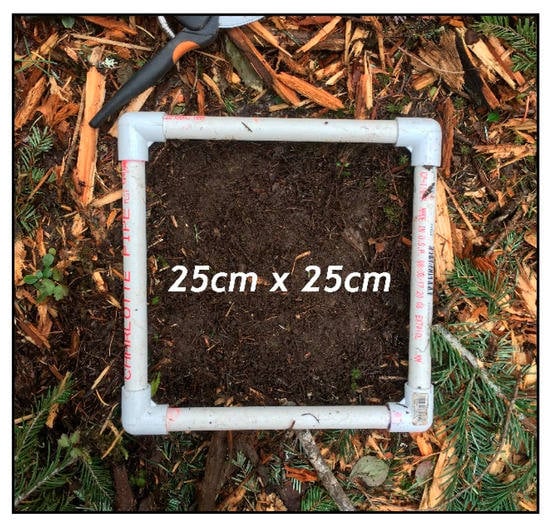 Frames made of PVC pipe measuring 25 cm by 25 cm were built to establish the sampling area extent. Within the 25 × 25-cm collection quadrats, all fuel down to bare mineral soil was gathered, and any pieces extending outside the collection frame were trimmed using hand shears, and thus only pieces completely within the frame were collected (Figure 5). All fuels collected were stored in paper bags labeled by their collection point and were brought back to the lab for detailed fuel composition analysis. Within the sampling quadrats, downed trees and logs were not sampled due to their irregular occurrence and collection difficulty for returning to the lab.
