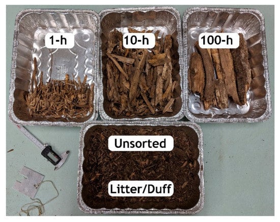 After field sampling was conducted, fuel collection bags were brought back to the lab to be processed by drying and sorting. A total of 133 quadrats of fuel was brought from the field for processing. If all plots had all quadrats collected, there would have been a total of 144. However, some quadrats were excluded from sampling because they were located on rock outcroppings, stumps, or other obstructions. One complete plot of quadrat fuel collections from stand 117, trees per hectare class 1, was misplaced during sampling, which constituted four of the eleven missing quadrat samples. Due to the omitted samples, stand 117 had two plots for trees per hectare class 1, resulting in 35 total plots rather than 36. Each collection sample was oven-dried at 105 degrees Celsius for 48 h, or until the sample weight stabilized, and was then weighted to the nearest gram. All fuels were then sorted, by quadrat, into five time-lag fuel classes: duff/litter and woody/masticated (1-h [<0.64 cm], 10-h [0.64–2.54 cm], 100-h [2.54–7.62 cm] and 1000-h [>7.62 cm]) [] (Figure 7). Sorted fuels were then individually weighed to the nearest gram to determine the proportion of overall mass that each fuel class represented. These proportions for each quadrat were averaged with corresponding plot quadrats to determine the fuel composition proportions by mass for the entire plot. For each of the 35 sample plots, the fuel bed volume was calculated by multiplying the average of the fuel depths at the nine measured locations within each plot by the dimensions of the collection frame. We then determined the bulk density of the fuels in each plot by dividing the average oven-dried weight of the fuel classes in the four collection quadrats by the corresponding volume. Plot level values were calculated using the averages of each quadrat within the plot for fuel loading (Mg ha−1) for the whole stand and by fuel class, fuel depth (cm), and bulk density (kg m−3).