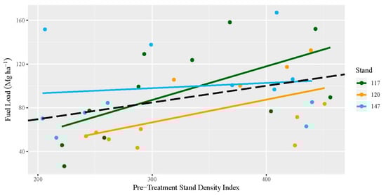 Surface fuel loading (Mg ha−1) of all sampled plots by pre-treatment stand density index (SDI). The black dotted line represents the regression for all data, and the colored solid lines indicate the regression lines for each stand individually.