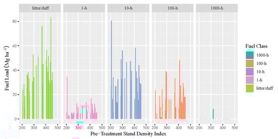 Surface fuel loading (Mg ha−1) distribution for all sample plots by pre-treatment stand density index (SDI) arranged by time-lag fuel class.
