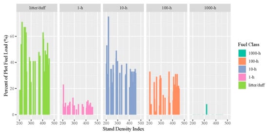 The data distribution for the five time-lag classes as a percentage across the range of stand density indices and fuel loading are shown in Figure 10. Woody and mulched fuels (1-h, 10-h, 100-h, and 1000-h) were found to be between 30–85% of the overall fuel loads across all plots, which shows the variability found within the stands. 1-h, 10-h, 100-h, and 1000-h fuels contained 6–27%, 36–94%, 0–57%, and 0–13% of the woody and mulched fuels, respectively. On average, woody fuels made up about 58.2% of the overall surface fuel loading across all sites, with 1-h, 10-h, 100-h, and 1000-h fuel classes averaging 7.5%, 33.2%, 17.3%, and 0.2% of the loading, respectively.