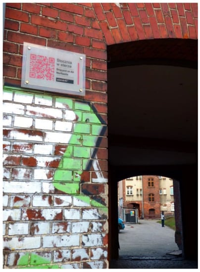 During the next study visit in March 2019, the researchers stayed on Jana z Kolna Street. It was a destroyed, workers’ building, which used to be adjacent to a long wall fencing the shipyard that no longer exists. Between the years 2004 and 2012, there used to be a mural painted on this wall by Iwona Zając. The mural was entitled “Shipyard” and now, on the wall of this apartment building, there is information about it and a QR code redirecting to its webpage http://www.stoczniaweterze.com (Figure 2). This Internet site has a Polish and an English version and it presents pictures and information about the mural [52].