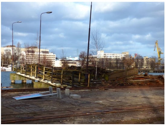In 1999, the Gdańsk Shipyard started to move its very limited production activities to Ostrów Island. Currently, this area is occupied by two small companies: the Gdańsk Ship Repair Yard and the Gdańsk Shipyard. It is an isolated area, separated by a channel, with restricted access (Figure 8 and Figure 9).