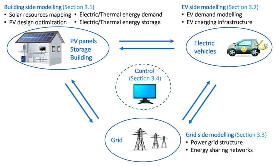 | Barone et al. (2019) [50] | Naples, Italy | Y | Y | N | Y | N | Matlab | Proposed a novel energy management system for buildings connected in a microgrid, by considering EVs as active storage components of such an energy scheme. | Such B2V2B (i.e., Building to vehicle to building) integration enables renewable sharing among different buildings. |