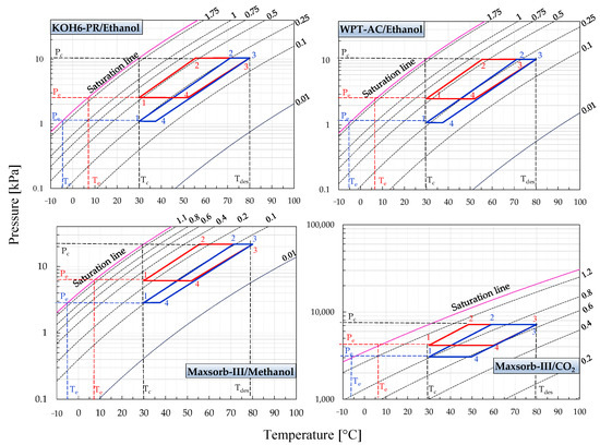 Pressure–temperature–concentration (P-T-W) diagrams of KOH6-PR/ethanol, WPT-AC/ethanol, Maxsorb-III/methanol and Maxsorb-III/CO2 pairs presenting the ideal (red line) adsorption cooling cycle (Te = 7 °C) and (blue line) adsorption refrigeration cycle (Te = −5 °C) for a desorption temperature of 80 °C.
