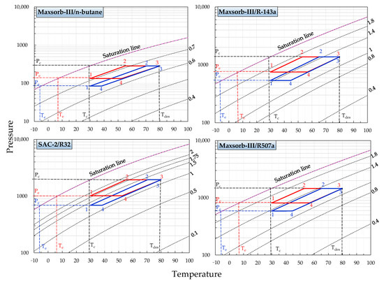 P-T-W diagrams of Maxsorb-III/n-butane, Maxsorb-III/R-134a, SAC-2/R32 and Maxsorb-III/R507a pairs presenting the ideal (red line) adsorption cooling cycle (Te = 7 °C) and (blue line) adsorption refrigeration cycle (Te = −5 °C) for a desorption temperature of 80 °C.
