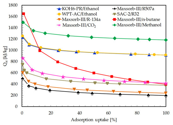 The isosteric heat of adsorption is evaluated for all selected pairs using the Clausius–Clapeyron equation (see Equation (11)). The isosteric lines of different constant uptakes (from initial to saturated uptakes) are developed by linear plot between ln P and 1/T. The Qst values are calculated from the slope of each isosteric line. The average values of Qst from these plots are used for the calculation of Qref (see Equation (9)). A plot of isosteric heat of adsorption vs. adsorption uptakes is presented in Figure 4. The adsorption uptake is taken in percentage, which is the ratio of equilibrium uptake to saturated adsorption uptake. Isosteric heat of adsorption decreases with the increase in adsorption uptake, as reported in many studies [32,59].