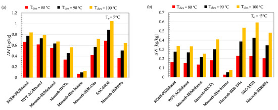 Comparison of ΔW for the assorted pairs at different desorption temperatures for (a) cooling (Te = 7 °C) and (b) refrigeration (Te = −5 °C) applications.