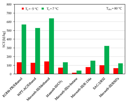Comparison of specific cooling effect (SCE) between the assorted pairs at a desorption temperature of 80 °C for adsorption cooling application (Te = 7 °C) and refrigeration application (Te = −5 °C).