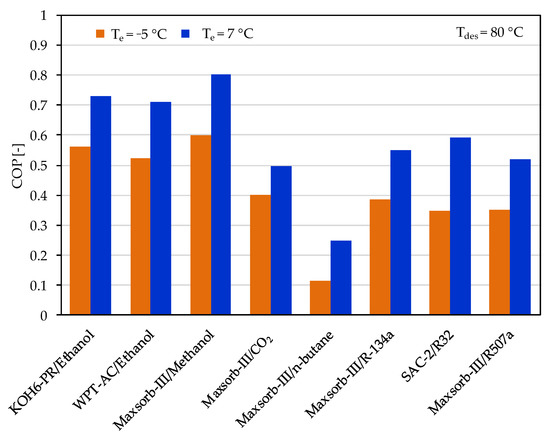 Comparison of the coefficient of performance (COP) between the assorted pairs at a desorption temperature of 80 °C for adsorption cooling application (Te = 7 °C) and refrigeration application (Te = −5 °C).