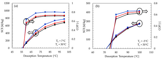 - There is a significant increase in the coefficient of performance for the desorption temperature range of 60 to 80 °C. Afterwards, no considerable variation in COP is noticeable with an increasing SCE.