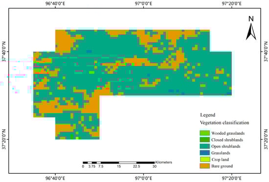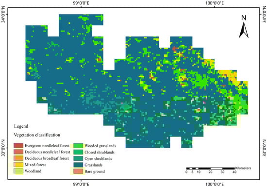 Vegetation data used was global 1 km land surface coverage data provided by the University of Maryland (Table 1). These data divided the land cover types into 14 types [,], referring to the parameters of each model in the global land surface data assimilation system to extract the vegetation coverage data of each grid. Figure 3 and Figure 4 show the vegetation classification data in the study area.