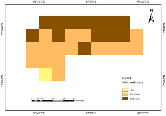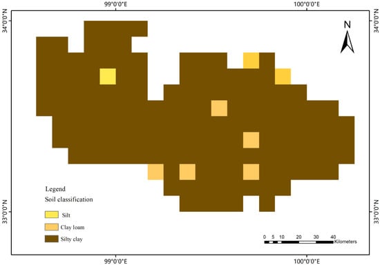 The soil data used were the soil classification of the global 5 min soil data released by FAO (Food and Agriculture Organization of the United Nations) [] (Table 2). Figure 5 and Figure 6 show the soil classification data in the study area.