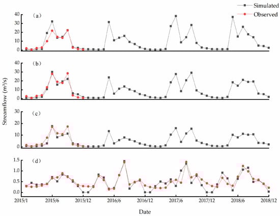 Figure 7 shows the comparison between the simulated runoff and the measured runoff of the study areas in the period 2015–2018. On the monthly scale, the simulated runoff of the model was generally consistent with the measured runoff.