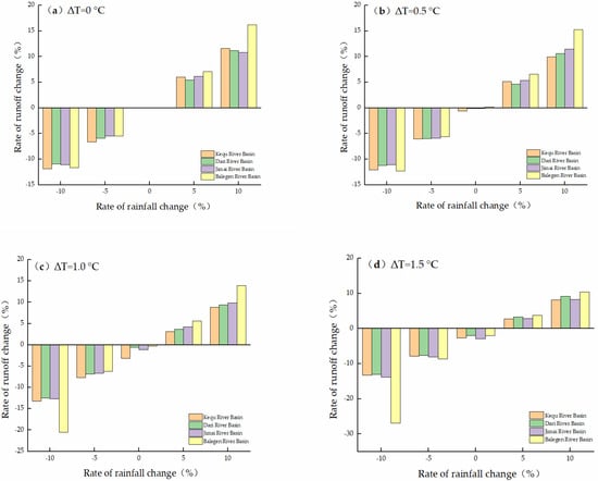 The four graphs in Figure 8 show the impact of changes in rainfall on runoff as the temperature increases by 0, 0.5, 1.0, and 1.5 °C, respectively. When the temperature increased, the runoff of the river basin decreased to varying degrees. The rainfall–runoff changes in the four basins shown at 8a–d were approximately linearly related. In the Balegen River basin of (c) and (d), when rainfall decreased by 10%, the amount of runoff change was relatively large. This may be because the Balegen River basin is in an inland arid area and belongs to a plateau continental climate. The air in the basin is dry and windy. The runoff in the basin is a form of infiltration excess runoff. When the temperature rises and the rainfall suddenly drops, the runoff suddenly decreases.