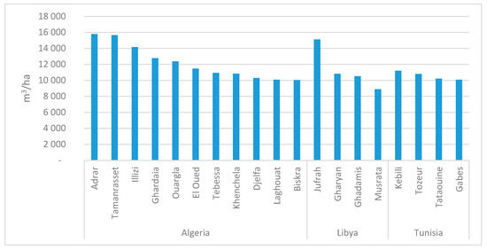 Modelling results indicate that the total annual irrigation water requirement in the entire NWSAS is about 3.25 billion m3 (or 11,700 m3/ha). These values are close to the local statistics for water abstraction reported by OSS and local experts [12]. Figure 5 shows the estimated annual water demand (m3/ha) based on the selected crops for each province (Table 2). It can be observed that Adrar, Illizi, Tamanrasset and Jufrah exceed the level of 14,000 (m3/ha), whereas other provinces are between 10,000 –12,000 (m3/ha), and only Musratah is below the 10,000 (m3/ha) threshold. Different parameters affect the irrigation water requirement such as evapotranspiration, which depends on wind speed, temperature and solar radiation. Areas like Adrar have high solar irradiance and wind speed (see Figures S2 and S3 in the Supplementary Materials), which result in higher evapotranspiration and, accordingly, irrigation needs. Another important parameter is the type of crops cultivated in each province, which influences different water requirements (see Table 2).