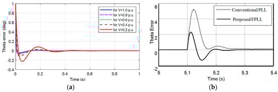 The Equation (17) indicates that error in theta, where theta is depends on the real pole (a) and complex pole (ξωn). The ramp reduction of input voltage magnitude results in the raise of the magnitude of ‘a’ and reduction in the magnitude of ξωn. Table 1 shows the change overshoot and damping ratio for variation in input voltage. Figure 4a shows the change in the magnitude of input voltage, which results in a decrease in the transient response of the system due to an increase in magnitude (‘a’). For different bandwidths, the settling time of FPLLs, increase gradually and remain stable. Figure 4b shows the theta error for a step-change in frequency, from Figure 4b, it is observed that the increase in damping ratio reduces the transients of proposed FPLL with fewer steady-state errors when compared to the conventional system.