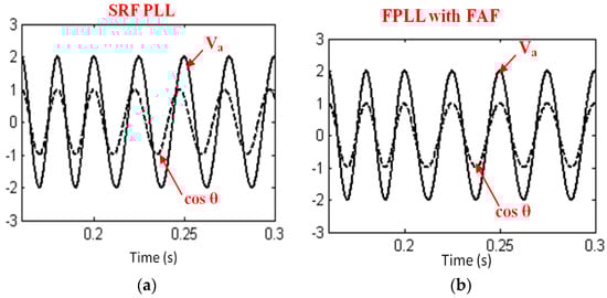 Response for frequency changeover from 50 to 40 Hz: (a) cos θ of SRF PLL, (b) cos θ of FPLL with frequency adaptive filter output.