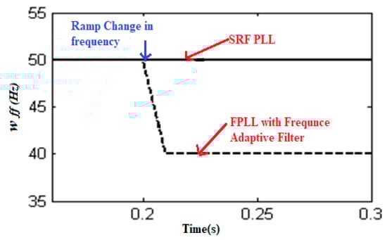The performance of SRF PLL and the proposed adaptive feed-forward PLL under a wide change in frequency is depicted in Figure 8. From Figure 8, it is observed that SRF PLL performance is unsatisfactory due to constant feed-forward frequency whereas, in FPLL with adaptive filter, there is a dynamical change in the feed-forward frequency due to the deviations in the supply frequency which quickly eliminates the frequency error. This helps to improve the dynamic response of the FPLL.