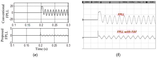 The performance of FPLL with a frequency adaptive filter with harmonic input is tested by measuring the input current of a 3-ϕ uncontrolled diode bridge rectifier. Because of the presence of multiple of the fundamental frequency (5th and 7th order) in the input signal, the qd axes have a ripple of 300 Hz. The occurrence of 300 Hz in qd axis is highly attenuated by FPLL with a frequency adaptive filter, and the system performance is shown in Figure 11a,b.