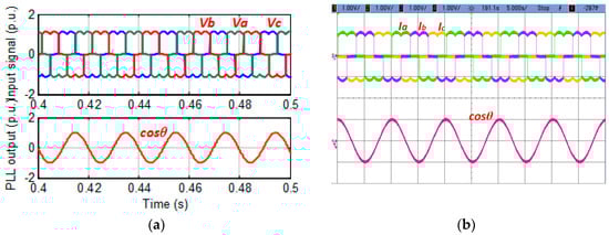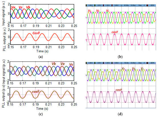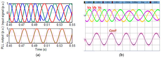 The phase jump is the second condition, which is considered to show the effectiveness of the proposed PLL. In this condition, the sudden turning ON/OFF of inductive/capacitive load or a fault in the grid creates a change in phase of the load terminal voltage. To verify the effectiveness of the FPLL with a frequency adaptive filter under this situation, a phase shift of 30° is created with a 30% voltage sag is applied to the ‘A’ phase at time of t = 0.5 s. The simulation and experimental response of the adaptive FPLL (Figure 10a,b) illustrates the effectiveness of the proposed PLL under phase jump. FPLL with frequency adaptive filter locks to input supply and results in an undistorted synchronization signal (cosθ) is formed, which can be observed from the waveforms.