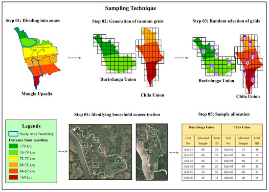 We considered household as the targeted unit of the sample. For this, we divided Mongla district into five diverse zones depending on the coastal proximity. Then we opted to introduce several grids (i.e., cells) on the map of two targeted unions. Afterwards, we picked six grids that were randomly selected by performing the automatic cell selection process through computer platforms (See Figure 3 for details).