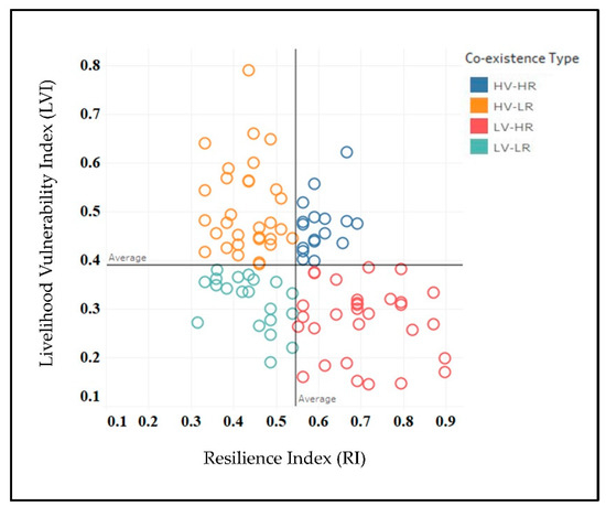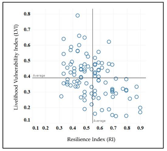 The household-level livelihood vulnerability index (LVI) and resilience index (RI) is measured and graphically plotted in Figure 4 where the “y” axis represents a household’s vulnerability scores and “x” axis illustrates a household’s resilience scores. This juxtaposition aims to categorize households depending on their vulnerability and resilience considerations. The figure identifies four possible types of co-existence that endure in the lives of coastal residents. Note that the boundaries of each quadrant are exemplifying average scores of these indices. Different thresholds may have produced different classifications, although the general tendencies revealed in Table 1 remains true if other thresholds are used.