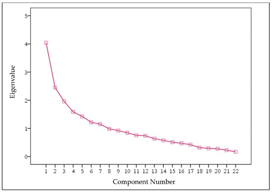 In the PCA, the Kaiser–Meyer–Olkin measure has verified the sampling adequacy for the analysis with a value of 0.616. This is well above the acceptable limit of 0.5. Moreover, the Bartlett’s test of sphericity demonstrates significance at p < 0.0001, indicating that correlations between items are sufficiently significant for PCA and the average communality is >0.500. Thus, factor analysis is considered statistically valid [46,47]. Seven components/factors have been retained following the Kaiser criterion, (i.e., only factors/components having Eigenvalue > 1) and “point of inflexion” of Tabachnick and Fedell [48]. The scree plot is slightly ambiguous and indicates inflexions that will justify retaining components up to seven. In the seventh component, the “point of inflexion”, i.e., stable plateau, is observed in the scree plot (Figure 6). Collectively, these seven principal components accounted for 62.89% of the variance in the original 22 variables included in the analysis.