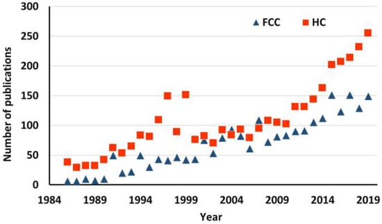 The direction of the research supports the industrial trend. A search in Web of Science was performed for keywords “hydrocracking” and “fluid catalytic cracking”. The number of publications for each year is shown in Figure 1.