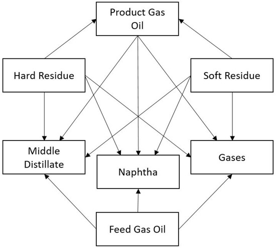 While the earlier models had a focus on the feed conversion (global lumping or single lumping) [9], later research shifted towards lumping the mixture according to their similarities (discrete lumping). Increasing the number of lumps, increased the amount of information that can be gathered at the expense of higher computational effort. One of the earliest lumped models was suggested by Mosby et al. with seven lumps [34]. Their suggestion of lumps, which served as a base network for other research, is given in Figure 3. With its three feed lumps (feed gas oil, soft and hard residue) and their conversion to the four product lumps (gas oil, middle distillate, naphtha, and gases), this model aimed to represent the inhomogeneous nature of the mixture using different chemical reaction kinetic coefficients. Every directed arc of the network shows a conversion of one lump into the other; therefore, the reaction network given in Figure 3 considers 14 reactions between its lumps with different kinetic coefficients.