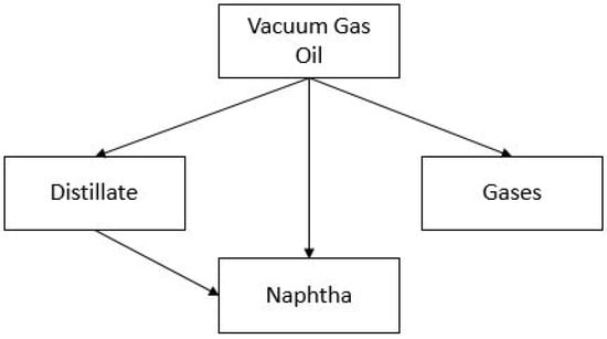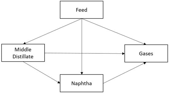 Increasing computational power and the development of continuous models have not eliminated the use of discrete lumped models. They are faster than continuous models and flexible with varying numbers of lumps adjusted according to the need of the application. More recent works can be found in the literature with different numbers of lumps. In one study, a four-lump model was developed for a hydrocracker with a vacuum gas oil as its feed stream and middle distillates, naphtha, and gas as the product streams [42]. All six reactions of these four lumps were considered to represent the secondary cracking mechanisms (cracking of the product lumps with the increasing residence time), unlike previously mentioned seven-lump model considering the secondary cracking of only the product gas oil stream. This network, given in Figure 4, was found to have a good data fitting capability, and later, it was used by other researchers.