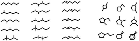 Building a SEMM is not a trivial task. Next to the computational effort, it is highly demanding in terms of molecular analysis. In Figure 6, some compounds are given. With the increasing number of carbons, the number of compounds increases together with the analysis intricacy. Furthermore, these compounds differ in reactivity, which affects the rate coefficients of their reactions. Svoboda et al. built a network of more than 400 possible reactions of 154 compounds to describe octane hydrocracking [47]. A full-scale SEMM includes thousands of compounds and their reactions.