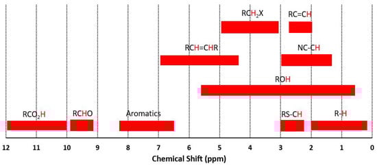 NMR spectroscopy was tested for TBP curve characterization by multiple researchers. Filgueiras et al. used NMR to predict T10, T50, and T90 values using the support vector machine (SVM) and PLS regression models and obtained a better data fit by using SVM [75]. For the heavy feedstock, root mean square error of prediction (RMSEP) values were found significantly high for the TBP curve prediction. However, this does not confound the useability of NMR for refining applications. The chemical shift locations of NMR spectrum is given in Figure 8. Different H atoms are located separately on the spectrum due to their surrounding atoms, and thanks to that feature, different characteristics of the mixture can be calculated.