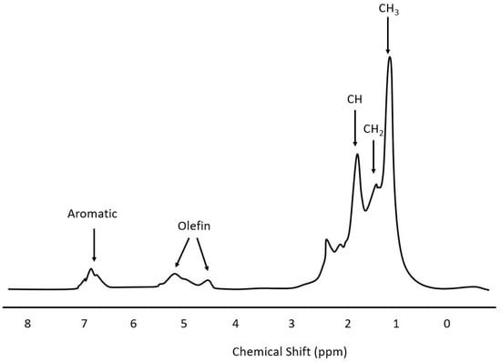 Another study showed a better data fit by using NMR with PLS regression models, built to predict product yields, sulfur, nitrogen, and metal content [76]. The high accuracy was obtained thanks to the selection of crude oil from a specific region. The lower accuracy was confirmed by other researchers for more generalized models [77]. A hydrocarbon mixture NMR spectra is given in Figure 9 and by using Figure 8, alkane, alkene, and aromatic peaks can easily be observed.