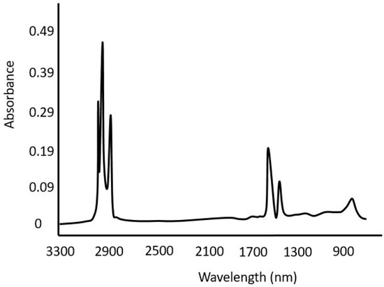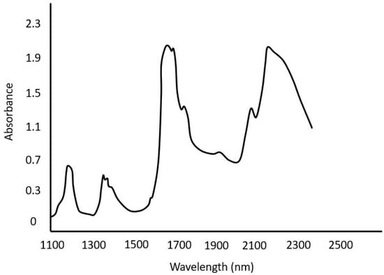 NIR spectroscopy and its use in refinery applications are investigated deeply. Thanks to the new methods in statistical analysis, the prediction accuracy is improved. Pasquini and Bueno compared PLS regression and ANN models, which were built to predict the TBP curve and API gravity of hydrocarbon mixtures [78]. A PLS regression model showed better performance. In this work, it was also demonstrated that wavelength selection should be done carefully as it might bring a considerable improvement or a loss. They selected three wavelength regions to build their models on (2000–2500 nm (I), 1650–2500 nm (II), 1100–2500 nm (III)), and found that the model using region (I) performed the best and (II) the worst. Although (II) has all the information included in (I), it performed worse due to the additional region without relevant information and hence more noise. A hydrocarbon mixture NIR spectrum is given in Figure 10.