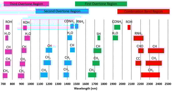 Unlike NMR giving information of an individual atom in different molecules, the NIR spectrum carries chemical bond information of the analyzed substance. Different bond locations of the NIR region are given in Figure 11, which also shows the importance of wavelength selection. Some bond information can be found in multiple locations. For example, the C-H bond is observed in combination and overtone regions, unlike S-H, which is only observed in the first overtone region.