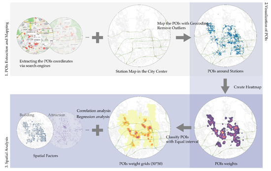 Points of interest (POIs) are regions of influence where citizens concentrate because of attractions or facilities that draw high numbers of people [1,2,3,4]. They are characterized by a concentration of facilities, a repetition of various activities, and high traffic volume. Accordingly, POIs are considered places where the energy of a city is focused, and understanding the form and size of POIs provides insights into how people experience cities. This then facilitates the selection of target points for public transit, urban development, and urban beautification, particularly in the context of urban planning with limited resources [2,5,6,7,8,9,10,11,12,13,14,15].