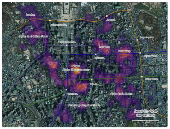 Figure 3 illustrates the results of measuring the POIs near the seven stations within the Seoul City Wall. The POIs are concentrated near Seoul City Hall and characteristically formed near alleyways. This phenomenon is more pronounced near City Hall—in the Seochon neighborhood, a densely populated traditional housing area—and in the regions of Iksun-dong and Insa-dong, old sections of the city.