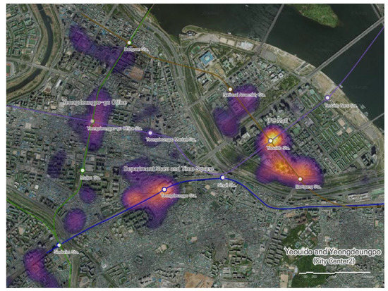 Figure 4 illustrates the results of measuring the POIs near the stations in the Yeouido and Yeongdeungpo regions mentioned above. These POIs tend to be situated within blocks—likely as a result of dense human activity within these blocks—as multiple businesses are located within large buildings. The identified POIs are also concentrated around the offices and large markets of the Yeongdeungpo area.