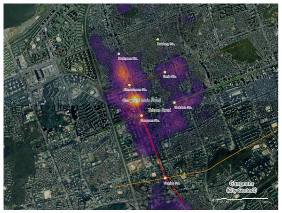 The search keywords were set using the keyword suggestion service of the search portal, with only spatial keywords selected from the suggested keywords provided when each station was searched. The keyword suggestion service was provided by analyzing search trends, behaviors, and relevance and is based on user traffic. The suggested terms indicate user attraction, and in the process of deriving the POI, the keyword related to the top searched region was used as the related search keyword by using the keywords ranked at the top through an analysis of the related search words of the search engine. This study utilizes the GIS temperature map function to estimate comprehensive POI areas, including non-residential buildings in residential areas. This method supplements the identification of specific keywords, and subsequently, the following suggested keywords were used: restaurants, bars, cafes, entertainment, diners, etc. These keywords were the most searched keywords in the region under analysis. These keywords differed across regions and stations.
