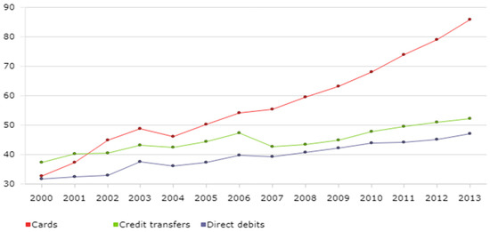 SEPA (Single Euro Payments Area) deals with harmonization with the way cashless euro payments are made across Europe and establishes a single set of tools and standards that make cross-border payments in euro as easy as national payments. Regarding the rules on charges for cross-border payments in euro, the principle of equal charges applies for: credit transfers, direct debits, withdrawals at cash dispensers (ATMs), payments by debit and credit cards, and money remittance. The most popular and most used payment instruments are credit transfers, direct debits, and credit cards [15,16,17,18,19]. In Figure 1, we can see that the growth in electronic payment instruments registered an upward trend over time. This means that non-cash payments could achieve sustained growth throughout Europe if payment service providers, customers and merchants would fully engage in their use and development.
