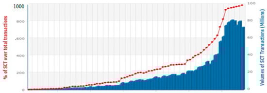In the figure below (Figure 3), we can see the share of SCT in the inter-bank domain as a percentage of the total volume of credit transfers. The use of the new SEPA product is higher with the higher value of SCT. A value of 100% would mean that that only SEPA products are used and have fully substituted other instruments. Additionally, the bars show the total number of SCT transactions analyzed by the infrastructures from the Eurozone.
