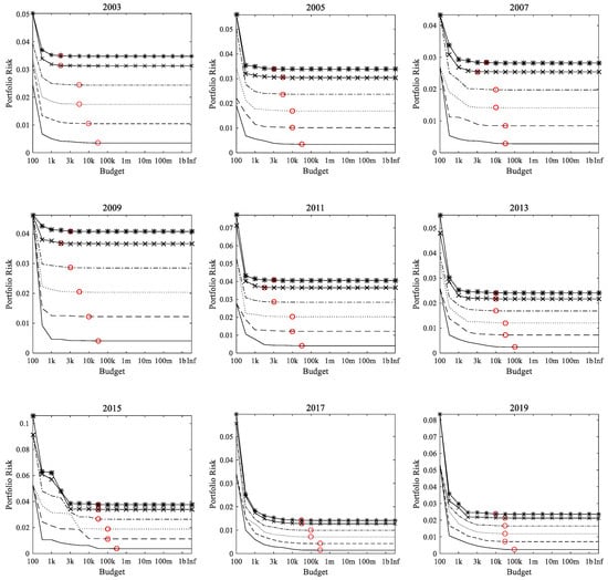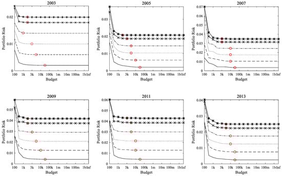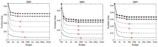 Figure 1, Figure 2, Figure 3, Figure 4, Figure 5 and Figure 6 present our results on the standard deviation of portfolio returns that invest in stocks of the six countries, for various levels of budget. The minimum required budget necessary for constructing fully risk-diversified portfolios are marked with empty circles, where fully risk-diversified portfolios are classified as portfolios with less than one percent difference in portfolio variance, which is the objective value of the portfolio problem, compared to the optimal mean-variance portfolio without budget constraints. The optimal portfolio with no size constraint is the reference point because it is considered the maximally risk-diversified portfolio for a given level of required return. While results for odd years are only shown in these figures, findings for even years are similar to that of adjacent years, and a summary of the entire period is presented in Figure 7 and Figure 8. Achieving positive expected returns was impossible during 2008 in UK and these cases are denoted as “infeasible” in our results.
