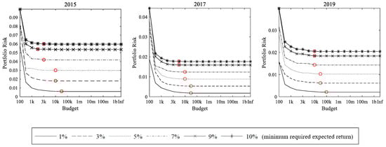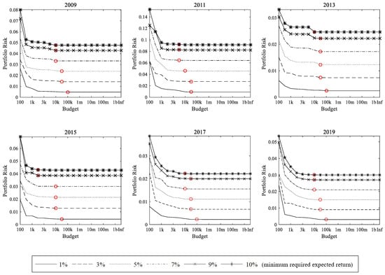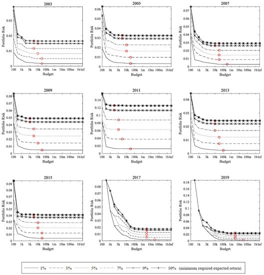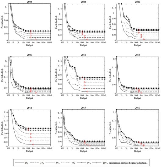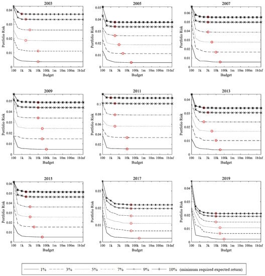 The main objective of portfolio diversification is to diversify risk and hence reduce the overall risk of a portfolio. Therefore, we examine the risk of a portfolio as measured by the variance of returns. Furthermore, to see the impact of investment budget on portfolio risk, we solve the problem given by (1) repeatedly with various levels of minimum required expected annual returns,