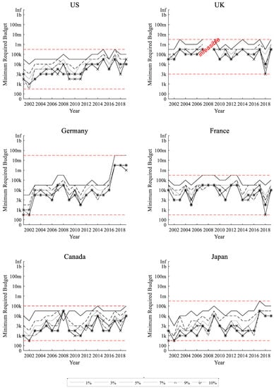 As presented in Section 4, our results show that it is possible to explore full risk diversification with as low as $1000 or $2000 in some cases. Even though other cases require a larger budget, it will be easier to achieve larger diversification effects with a low budget in practice. The analysis in this study uses the largest 50 stocks in each market for forming risk-diversified portfolios. Since the problem restricts the choice of assets to only 50 stocks, it will be much more advantageous to consider more stocks especially under a tight budget because stocks trading at high price are out of reach. For example, an individual with a $1000 budget cannot purchase stocks trading above $1000 (e.g., Amazon, WA, USA) and can only purchase three shares of stocks trading around $300 (e.g., Apple, CA, USA). Moreover, firms with large market capitalization tend to trade at a relatively higher price (e.g., five largest firms in the US all trade at above $100), and thus, our test settings make it more difficult to achieve diversification. Nonetheless, the choice of using the largest 50 stocks is a reasonable representation of individual behavior because most individuals invest in companies they are familiar with [31,32].