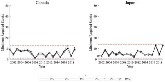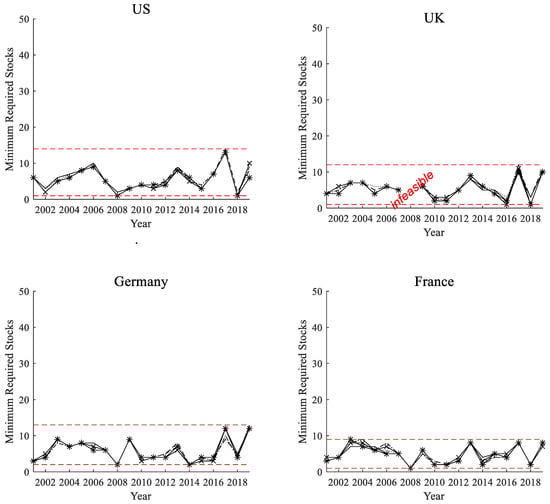 The results reveal three significant findings. First, it is very clear from Figure 1, Figure 2, Figure 3, Figure 4, Figure 5 and Figure 6 that having a larger portfolio does not help in reducing risk through diversification after a certain point. This is clearly evident in all six countries. Additionally, it is interesting to note that more money is necessary for constructing fully risk-diversified portfolios when the required return is smaller. This is likely because the optimization problems are tightly constrained when the required returns are large so that these problems do not have much opportunity to explore different solutions to reduce risk through diversification. On the other hand, less constrained problems are able to consider more candidates to reduce risk because they do not have to match large returns.