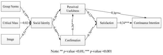 After testing the adaptability of the structural model to meet the basic criteria, we applied path analysis to test the hypotheses. In Figure 2 and Table 5, for the influence of group norms, perceived critical mass and image on the social identity, the path coefficient of group norms is 0.19, that of perceived critical mass is 0.02, and that of image is 0.51. This result indicates that the impact of group norms and image on social identity is significant, but that of perceived critical mass is not. For the influence of social identity on perceived usefulness and confirmation, the path coefficients are 0.36 and 0.49, respectively, which are significant. With regard to the impact of perceived usefulness on satisfaction and usage continuance intention, the path coefficients are 0.12 and 0.36, respectively, which are significant. For the effects of confirmation on perceived usefulness and satisfaction, the path coefficients are 0.26 and 0.76, respectively, which are also significant. Finally, the path coefficient of satisfaction on usage continuance intention is 0.34, which is also significantly positive.